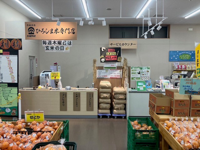 今回のリニューアルでは、正面入り口に「ひろしま米はひろしま愛プロジェクト」の大きなのぼりと店内精米売場上にPOPを設置しております。